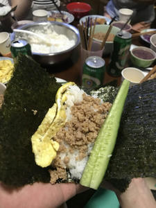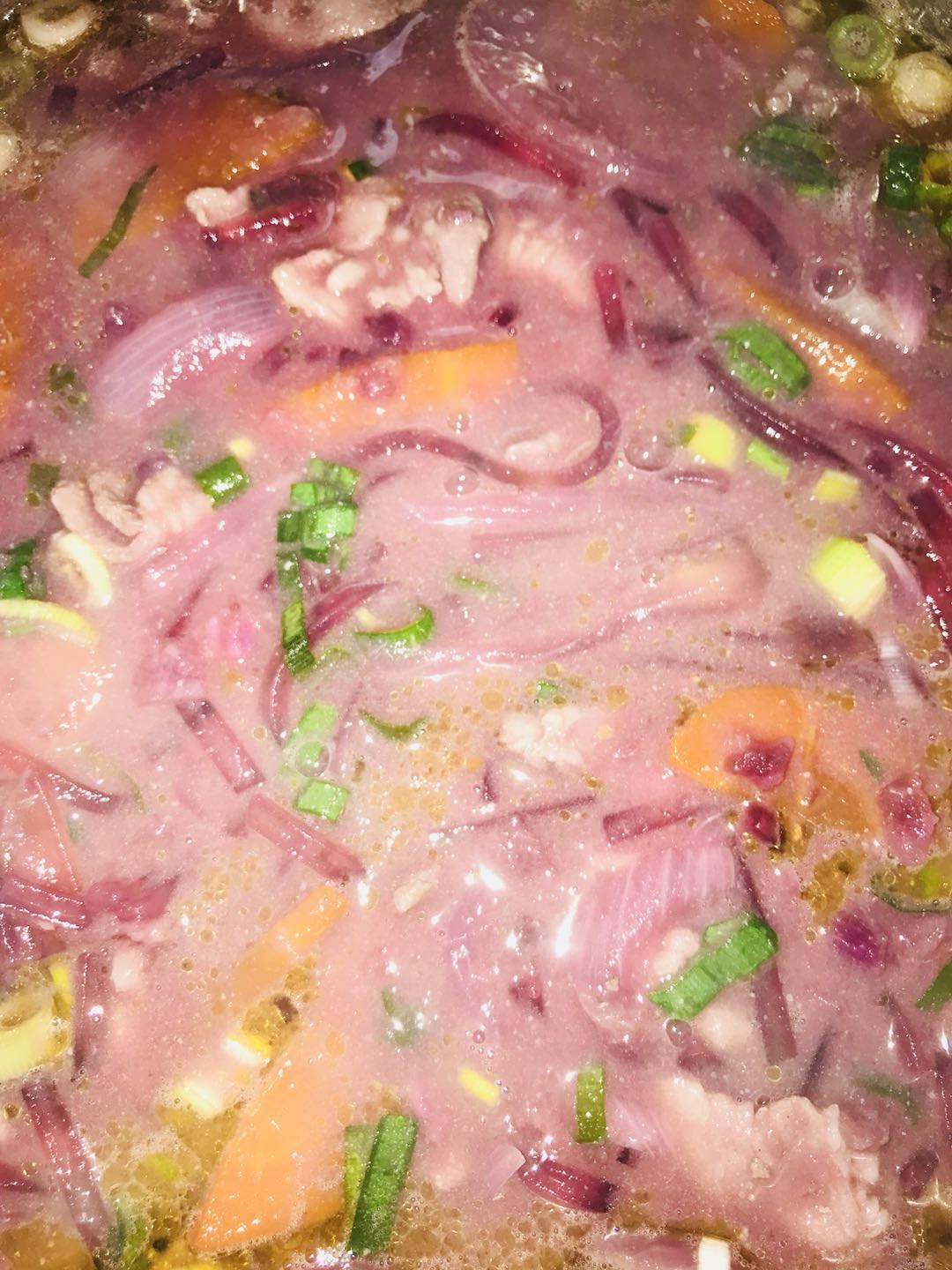手巻き寿司(具は肉ときゅうりとたまごだけ)と紫の豚汁!(紫芋つかったらこうなった)